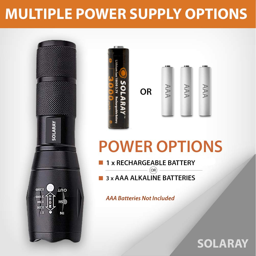 • Power Options: Powered by 1 x 18650 Lithium-ion Battery (included) OR 3 x AAA Alkaline Batteries (not included)